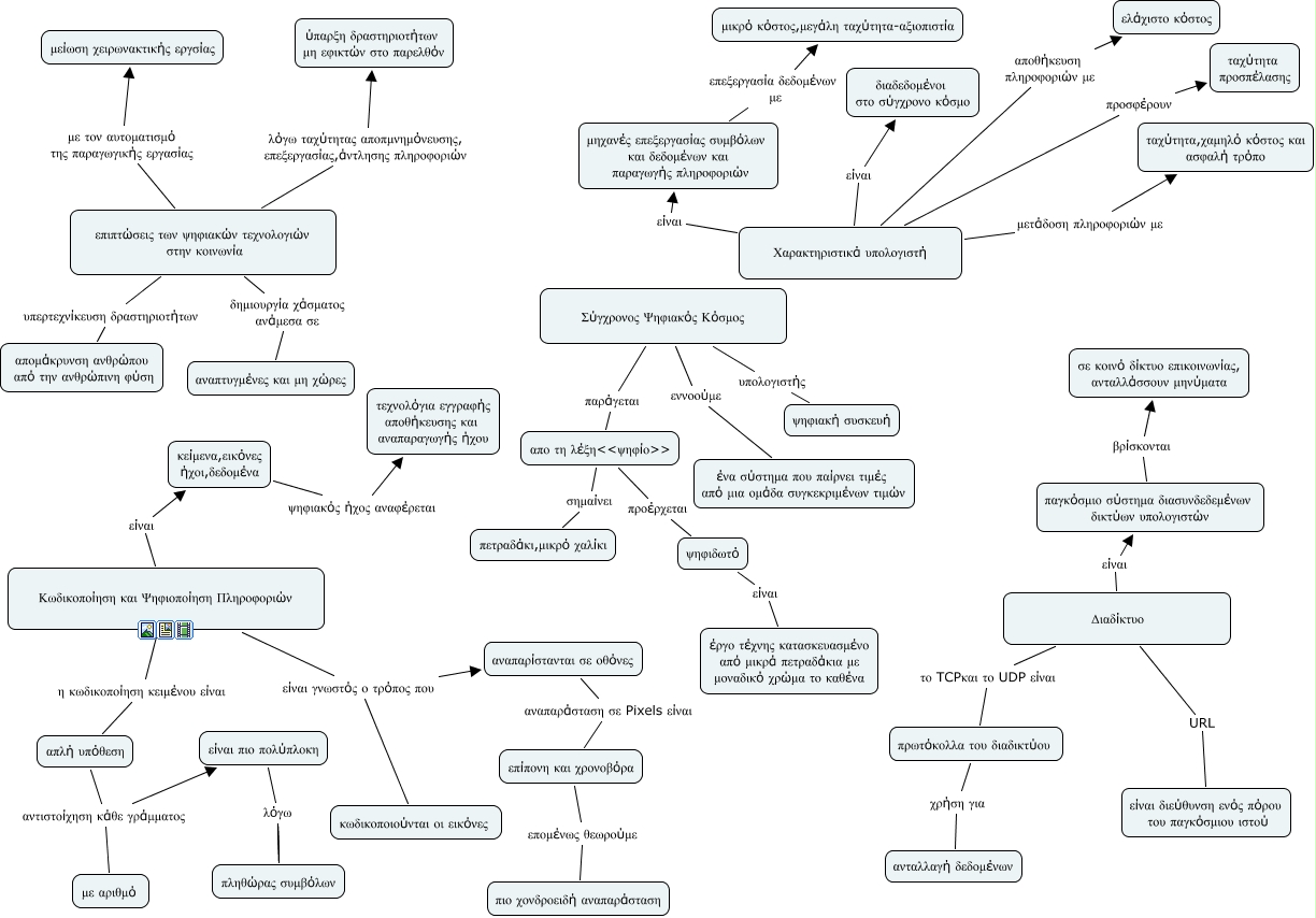 Αυτός ο εννοιολογικός χάρτης, που δημιουργήθηκε με το IHMC Cmap Tools, περιέχει πλήροφορίες που σχετίζονται με: Χωρίς τίτλο 2, είναι πιο πολύπλοκη λόγω πληθώρας συμβόλων, Χαρακτηριστικά υπολογιστή μετάδοση πληροφοριών με ταχύτητα,χαμηλό κόστος και ασφαλή τρόπο, Διαδίκτυο URL είναι διεύθυνση ενός πόρου του παγκόσμιου ιστού, αναπαρίστανται σε οθόνες αναπαράσταση σε Pixels είναι επίπονη και χρονοβόρα, επιπτώσεις των ψηφιακών τεχνολογιών στην κοινωνία με τον αυτοματισμό της παραγωγικής εργασίας μείωση χειρωνακτικής εργσίας, επιπτώσεις των ψηφιακών τεχνολογιών στην κοινωνία λόγω ταχύτητας αποπμνημόνευσης, επεξεργασίας,άντλησης πληροφοριών ύπαρξη δραστηριοτήτων μη εφικτών στο παρελθόν, απο τη λέξη<<ψηφίο>> σημαίνει πετραδάκι,μικρό χαλίκι, πρωτόκολλα του διαδικτύου χρήση για ανταλλαγή δεδομένων, κείμενα,εικόνες ήχοι,δεδομένα ψηφιακός ήχος αναφέρεται τεχνολόγια εγγραφής αποθήκευσης και αναπαραγωγής ήχου, επιπτώσεις των ψηφιακών τεχνολογιών στην κοινωνία υπερτεχνίκευση δραστηριοτήτων απομάκρυνση ανθρώπου από την ανθρώπινη φύση, Διαδίκτυο είναι παγκόσμιο σύστημα διασυνδεδεμένων δικτύων υπολογιστών, Σύγχρονος Ψηφιακός Κόσμος εννοούμε ένα σύστημα που παίρνει τιμές από μια ομάδα συγκεκριμένων τιμών, Σύγχρονος Ψηφιακός Κόσμος παράγεται απο τη λέξη<<ψηφίο>>, μηχανές επεξεργασίας συμβόλων και δεδομένων και παραγωγής πληροφοριών επεξεργασία δεδομένων με μικρό κόστος,μεγάλη ταχύτητα-αξιοπιστία, Διαδίκτυο το TCPκαι το UDP είναι πρωτόκολλα του διαδικτύου, Κωδικοποίηση και Ψηφιοποίηση Πληροφοριών είναι γνωστός ο τρόπος που αναπαρίστανται σε οθόνες, Χαρακτηριστικά υπολογιστή είναι διαδεδομένοι στο σύγχρονο κόσμο, Σύγχρονος Ψηφιακός Κόσμος υπολογιστής ψηφιακή συσκευή, Κωδικοποίηση και Ψηφιοποίηση Πληροφοριών είναι γνωστός ο τρόπος που κωδικοποιούνται οι εικόνες, απο τη λέξη<<ψηφίο>> προέρχεται ψηφιδωτό