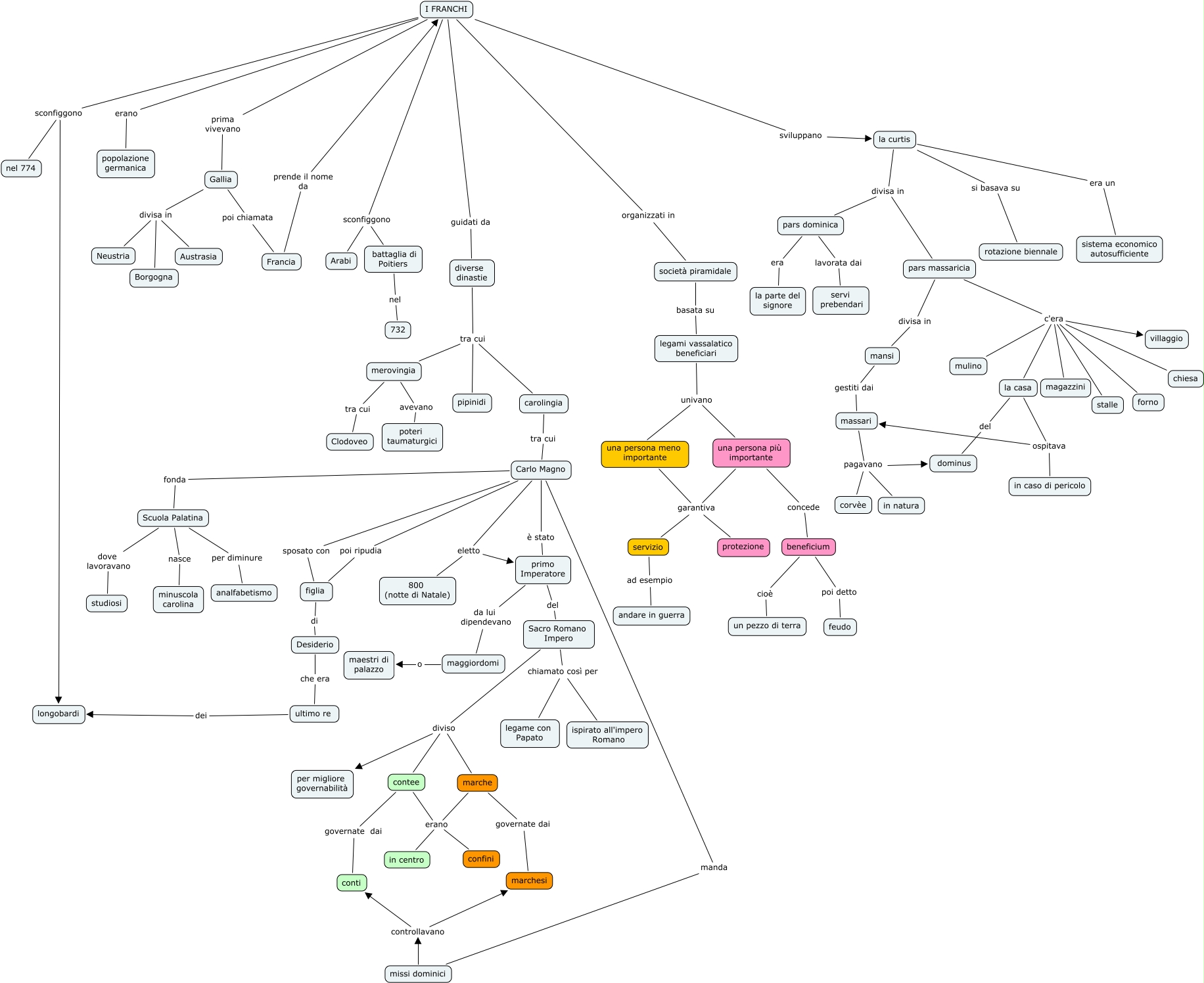 Questa Cmap, creata con IHMC CmapTools, contiene informazioni relative a: Franchi, Carlo Magno è stato primo Imperatore, la curtis era un sistema economico autosufficiente, una persona più importante garantiva servizio, contee governate dai conti, marche governate dai marchesi, una persona meno importante garantiva servizio, pars massaricia c'era mulino, pars massaricia c'era la casa, marche erano in centro, primo Imperatore del Sacro Romano Impero, I FRANCHI erano popolazione germanica, I FRANCHI organizzati in società piramidale, la casa ospitava in caso di pericolo, Carlo Magno sposato con figlia, primo Imperatore da lui dipendevano maggiordomi, pars massaricia c'era chiesa, una persona più importante concede beneficium, mansi gestiti dai massari, contee erano confini, Scuola Palatina dove lavoravano studiosi