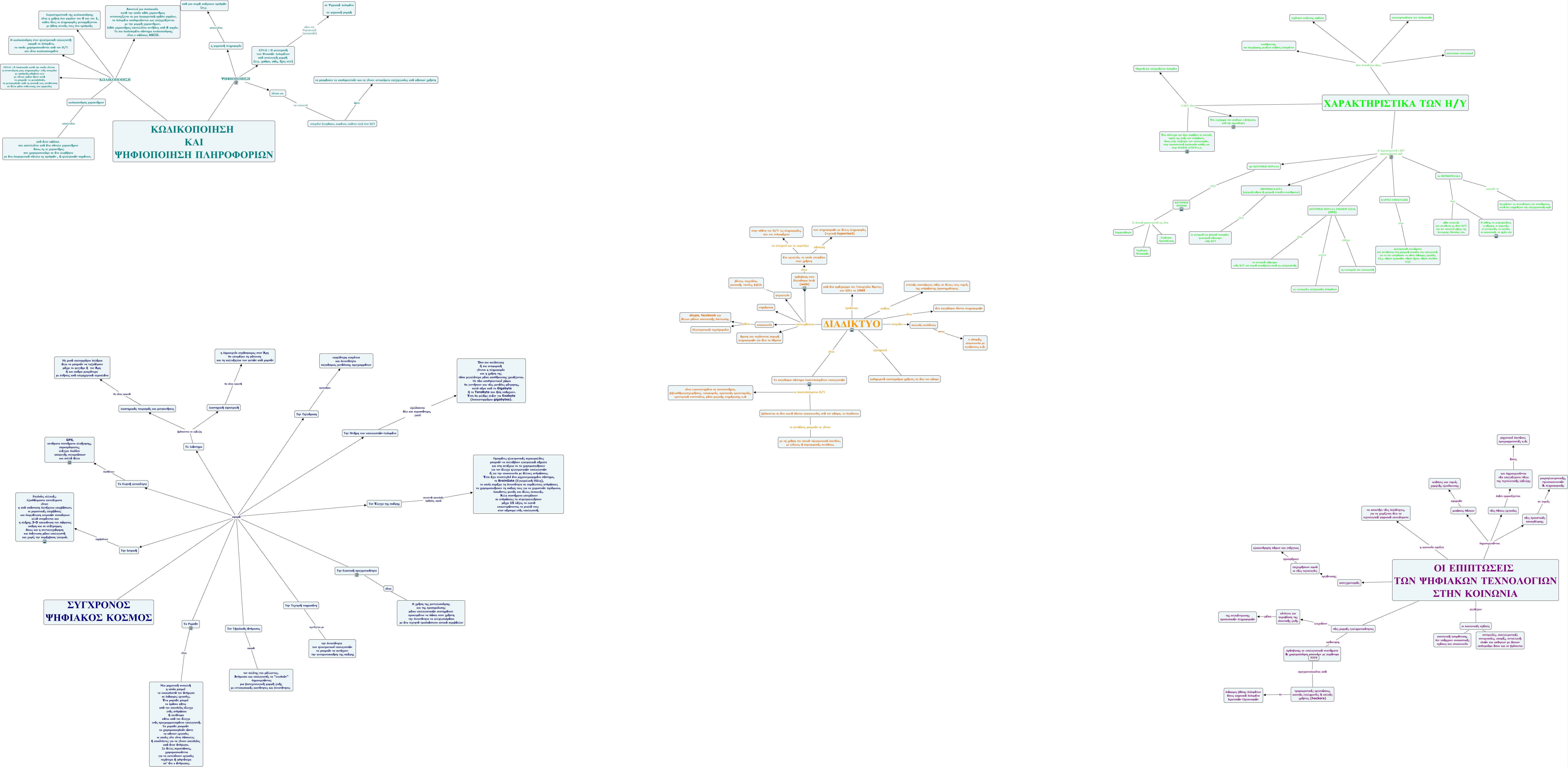 Αυτ�?ς ο εννοιολογικ�?ς χά�?της, που δημιου�?γήθηκε με το IHMC Cmap Tools, πε�?ιέχει πλή�?οφο�?ίες που σχετίζονται με: �?Ε�?ΔΩΡΑ�?Η ΓΕΩΡΓΙΑ (2615) �?�?ΖΙΔ�?Υ ΑΙ�?ΑΤΕΡΙ�?Η (4115), Την �?νήμη των υπολογιστ�?ν-Δεδομένα εξελίσσεται �?λο και πε�?ισσ�?τε�?ο, γιατί �?σο πιο πολ�?πλοκη ή πιο αναφο�?ική γίνεται η πλη�?οφο�?ία και η χ�?ήση της τ�?σο μεγαλ�?τε�?α μέσα αποθήκευσης χ�?ειάζονται. �?ι νέοι αποθηκευτικοί χ�?�?οι θα γεννήσουν και νέες μονάδες μέτ�?ησης, πολ�? πέ�?α απ�? το Gigabyte ή το TeraByte που ήδη υπά�?χουν. �?τσι θα μιλάμε πλέον για Exabyte (δισεκατομμ�?�?ια gigabytes)., Την Ιατ�?ική σημβαίνουν Ραγδαίες αλλαγές. Αξιοθάυμαστα επιτε�?γματα είναι: η απ�? απ�?σταση διενέ�?γεια επεμβάσεων, οι �?ομποτικές επεμβάσεις και διο�?γάνωση ιατ�?ικ�?ν συσκέ�?εων αλλά αναμένεται και η πλή�?ης 3-D απεικ�?νιση του σ�?ματος ακ�?μη και σε ολ�?γ�?αμμα, �?πως και η συνταγογ�?άφηση και διάγνωση μέσω υπολογιστή και χω�?ίς την πα�?έμβαση γιατ�?ο�?., ΧΑΡΑ�?ΤΗΡΙΣΤΙ�?Α ΤΩ�? Η/Υ δίνει δυνατ�?τητες �?πως επαναληπτικ�?τητα των διαδικασι�?ν, �?ΩΔΙ�?�?Π�?ΙΗΣΗ �?ΑΙ ΨΗΦΙ�?Π�?ΙΗΣΗ ΠΛΗΡ�?Φ�?ΡΙΩ�? �?ΩΔΙ�?�?Π�?ΙΗΣΗ Aποτελεί μια διαδικασία κατά την οποία κάθε χα�?ακτή�?ας αντιστοιχίζεται σε μια διαφο�?ετική ομάδα �?ηφίων, τα δεδομένα αποθηκε�?ονται και επεξε�?γάζονται με την μο�?φή χα�?ακτή�?ων. �?άθε χα�?ακτή�?ας αποτελείται συνήθως απ�? 8 �?ηφία. Το πιο διαδεδομένο σ�?στημα κωδικοποίησης είναι ο κ�?δικας ASCII., ΧΑΡΑ�?ΤΗΡΙΣΤΙ�?Α ΤΩ�? Η/Υ δίνει δυνατ�?τητες �?πως ταχ�?τητα εκτέλεσης π�?άξεων, Τον �?λεγχο της σκέ�?ης συναντά σπουδαία π�?�?οδο, αφο�? �?�?ισμένες ηλεκτ�?ονικές πε�?ικεφαλίδες μπο�?ο�?ν να συλλάβουν εγκεφαλικά σήματα και στη συνέχεια να τα χ�?ησιμοποιήσουν για τον έλεγχο ηλεκτ�?ονικ�?ν υπολογιστ�?ν ή για την επικοινωνία με άλλους ανθ�?�?πους. �?τσι έχει αναπτυχθεί ένα μηχανογ�?αφημένο σ�?στημα, το BrainGate (Εγκεφαλική Π�?λη), το οποίο πα�?έχει τη δυνατ�?τητα σε πα�?άλυτους ανθ�?�?πους να χ�?ησιμοποιήσουν τη σκέ�?η τους για να χει�?ιστο�?ν τηλέφωνα, διακ�?πτες φωτ�?ς και άλλες συσκευές. Άλλα συστήματα επιτ�?έπουν σε ανθ�?�?πους να πληκτ�?ολογήσουν μέχ�?ι 15 λέξεις το λεπτ�? επικεντ�?�?νοντας το μυαλ�? τους στον κέ�?σο�?α εν�?ς υπολογιστή., Διαστημική κηπου�?ική θα είναι εφικτή η δημιου�?γία ατμ�?σφαι�?ας στον Ά�?η θα επιτ�?έ�?ει τη φ�?τευση και τη καλλιέ�?γεια των φυτ�?ν απ�? �?ομπ�?τ, π�?�?σβαση στον Παγκ�?σμιο Ιστ�? (web) είναι ένα ε�?γαλείο, το οποίο επιτ�?έπει στον χ�?ήστη, ΔΙΑΔΙ�?ΤΥ�? π�?οέκυ�?ε απ�? ένα π�?�?γ�?αμμα του Υπου�?γείου Άμυνας των ΗΠΑ το 1969, ΧΑΡΑ�?ΤΗΡΙΣΤΙ�?Α ΤΩ�? Η/Υ Η Α�?χιτεκτωονική τ Η/Υ χα�?ακτη�?ίζονται απ�? τα ΠΕΡΙΦΕΡΕΙΑ�?Α, Την Τηλε�?�?αση π�?οσφέ�?ει υ�?ηλ�?τε�?η ευκ�?ίνεια και δυνατ�?τητα παγκ�?σμιας μετάδοσης π�?ογ�?αμμάτων, οι κοινωνικές σχέσεις συνομιλίες, επαγγελματικές συνε�?γασίες, επαφές, ανταλλαγή ιδε�?ν και απ�?�?εων με �?ποιον επιθυμο�?με �?που και αν β�?ίσκεται, τα ΠΕΡΙΦΕΡΕΙΑ�?Α μπο�?ο�?ν να διευ�?�?νουν τις δυνατ�?τητες του συστήματος, αλλά δεν επη�?εάζουν την επεξε�?γαστική ισχ�?, ΧΑΡΑ�?ΤΗΡΙΣΤΙ�?Α ΤΩ�? Η/Υ Η Α�?χιτεκτωονική τ Η/Υ χα�?ακτη�?ίζονται απ�? �?Ε�?ΤΡΙ�?Η �?�?�?ΑΔΑ ΕΠΕ�?ΕΡΓΑΣΙΑΣ (CPU), μει�?σεις θέσεων αφο�?ο�?ν κλάδους και τομείς χαμηλής εξειδίκευσης, Τα Ρομπ�?τ είναι �?ια μηχανική συσκευή η οποία μπο�?εί να υποκαθιστά τον άνθ�?ωπο σε διάφο�?ες ε�?γασίες. �?να �?ομπ�?τ μπο�?εί να δ�?άσει κά