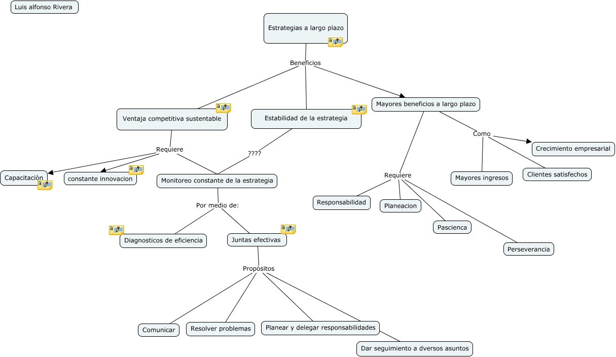 Este Cmap, tiene información relacionada con: Estrategias a largo plazo, Mayores beneficios a largo plazo Como Crecimiento empresarial, Mayores beneficios a largo plazo Como Clientes satisfechos, Juntas efectivas Propòsitos Comunicar, Estrategias a largo plazo Beneficios Ventaja competitiva sustentable, Monitoreo constante de la estrategia Por medio de: Diagnosticos de eficiencia, Ventaja competitiva sustentable Requiere Capacitaciòn, Estrategias a largo plazo Beneficios Mayores beneficios a largo plazo, Juntas efectivas Propòsitos Resolver problemas, Estrategias a largo plazo Beneficios Estabilidad de la estrategia, Mayores beneficios a largo plazo Requiere Perseverancia, Mayores beneficios a largo plazo Como Mayores ingresos, Estabilidad de la estrategia ???? Monitoreo constante de la estrategia, Mayores beneficios a largo plazo Requiere Responsabilidad, Monitoreo constante de la estrategia Por medio de: Juntas efectivas, Ventaja competitiva sustentable Requiere Monitoreo constante de la estrategia, Ventaja competitiva sustentable Requiere constante innovacion, Mayores beneficios a largo plazo Requiere Planeacion, Juntas efectivas Propòsitos Planear y delegar responsabilidades, Mayores beneficios a largo plazo Requiere Pascienca, Juntas efectivas Propòsitos Dar seguimiento a dversos asuntos
