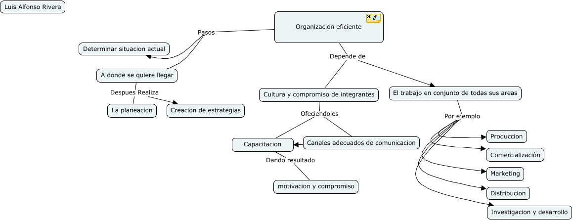 Este Cmap, tiene información relacionada con: Organizacion total-eficiente, Cultura y compromiso de integrantes Ofeciendoles Canales adecuados de comunicacion, El trabajo en conjunto de todas sus areas Por ejemplo Marketing, Organizacion eficiente Depende de El trabajo en conjunto de todas sus areas, El trabajo en conjunto de todas sus areas Por ejemplo Produccion, Organizacion eficiente Pasos Determinar situacion actual, Canales adecuados de comunicacion ???? Capacitacion, Organizacion eficiente Depende de Cultura y compromiso de integrantes, A donde se quiere llegar Despues Realiza Creacion de estrategias, A donde se quiere llegar Despues Realiza La planeacion, Cultura y compromiso de integrantes Ofeciendoles Capacitacion, El trabajo en conjunto de todas sus areas Por ejemplo Distribucion, El trabajo en conjunto de todas sus areas Por ejemplo Comercializaciòn, Organizacion eficiente Pasos A donde se quiere llegar, Capacitacion Dando resultado motivacion y compromiso, El trabajo en conjunto de todas sus areas Por ejemplo Investigacion y desarrollo