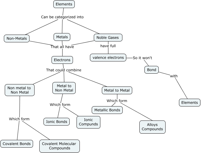 This Concept Map, created with IHMC CmapTools, has information related to: Elemental Bonds, Non-Metals That all have Electrons, Non metal to Non Metal Which form Covalent Molecular Compounds, Electrons That could combine Metal to Non Metal, Electrons That could combine Metal to Metal, Electrons That could combine Non metal to Non Metal, Metal to Metal Which form Alloys Compounds, Metal to Metal Which form Metallic Bonds, Metal to Non Metal Which form Ionic Compunds, valence electrons So it won't Bond, Bond with Elements, Metal to Non Metal Which form Ionic Bonds, Metals That all have Electrons, Noble Gases have full valence electrons, Non metal to Non Metal Which form Covalent Bonds, Elements Can be categorized into Metals, Elements Can be categorized into Noble Gases, Noble Gases That all have Electrons, Elements Can be categorized into Non-Metals