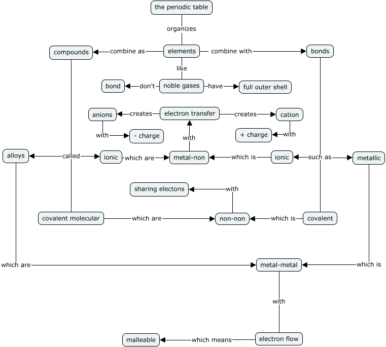 This Concept Map, created with IHMC CmapTools, has information related to: Bonds, non-non with sharing electons, compounds called alloys, noble gases don't bond, metal-metal with electron flow, electron transfer creates cation, compounds called covalent molecular, bonds such as metallic, electron transfer creates anions, ionic which is metal-non, the periodic table organizes elements, covalent molecular which are non-non, bonds such as ionic, noble gases have full outer shell, elements combine with bonds, compounds called ionic, electron flow which means malleable, elements combine as compounds, covalent which is non-non, alloys which are metal-metal, metal-non with electron transfer
