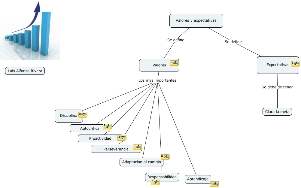Este Cmap, tiene información relacionada con: Valores y expectativas, Valores y expectativas Se define Expectativas, Valores Los mas importantes Disciplina, Valores y expectativas Se define Valores, Valores Los mas importantes Adaptacion al cambio, Expectativas Se debe de tener Clara la meta, Valores Los mas importantes Perseverancia, Valores Los mas importantes Aprendizaje, Valores Los mas importantes Autocritica, Valores Los mas importantes Responsabilidad, Valores Los mas importantes Proactividad
