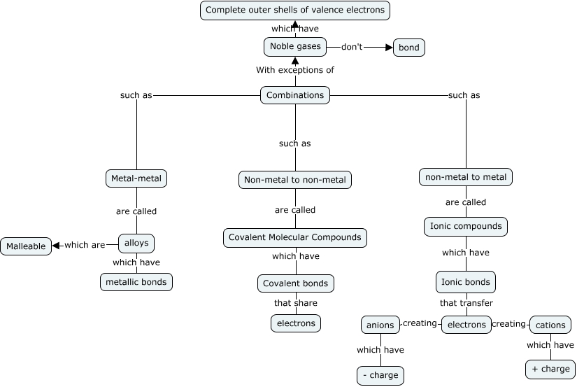 This Concept Map, created with IHMC CmapTools, has information related to: Bonds, anions which have - charge, Combinations With exceptions of Noble gases, Non-metal to non-metal are called Covalent Molecular Compounds, Ionic compounds which have Ionic bonds, Combinations such as Non-metal to non-metal, Combinations such as non-metal to metal, cations which have + charge, Noble gases which have Complete outer shells of valence electrons, Noble gases don't bond, Covalent bonds that share electrons, Metal-metal are called alloys, Combinations such as Metal-metal, alloys which have metallic bonds, Covalent Molecular Compounds which have Covalent bonds, electrons creating cations, non-metal to metal are called Ionic compounds, electrons creating anions, Ionic bonds that transfer electrons, alloys which are Malleable