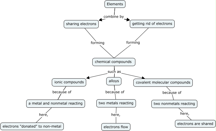 This Concept Map, created with IHMC CmapTools, has information related to: Elements Combine, Elements combine by getting rid of electrons, alloys because of two metals reacting, chemical compounds such as alloys, Elements combine by sharing electrons, two nonmetals reacting here, electrons are shared, chemical compounds such as covalent molecular compounds, Elements combine by getting rid of electrons, chemical compounds such as ionic compounds, Elements combine by getting rid of electrons, ionic compounds because of a metal and nonmetal reacting, Elements combine by sharing electrons, two metals reacting here, electrons flow, chemical compounds such as ionic compounds, ionic compounds because of a metal and nonmetal reacting, alloys because of two metals reacting, Elements combine by sharing electrons, ionic compounds because of a metal and nonmetal reacting, sharing electrons forming chemical compounds, a metal and nonmetal reacting here, electrons "donated" to non-metal, chemical compounds such as alloys