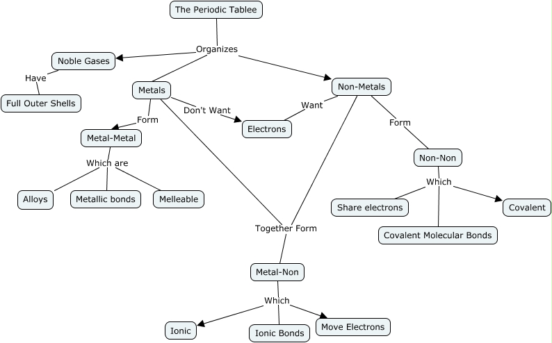 This Concept Map, created with IHMC CmapTools, has information related to: How do Elements Combine, Metal-Non Which Move Electrons, The Periodic Tablee Organizes Metals, Metal-Metal Which are Metallic bonds, Non-Metals Together Form Metal-Non, Metal-Metal Which are Alloys, Non-Metals Want Electrons, Non-Non Which Covalent Molecular Bonds, Non-Metals Form Non-Non, Metals Don't Want Electrons, Metals Together Form Metal-Non, Non-Non Which Share electrons, Metal-Non Which Ionic, Noble Gases Have Full Outer Shells, Metals Form Metal-Metal, The Periodic Tablee Organizes Noble Gases, Metal-Non Which Ionic Bonds, Metal-Metal Which are Melleable, Non-Non Which Covalent, The Periodic Tablee Organizes Non-Metals