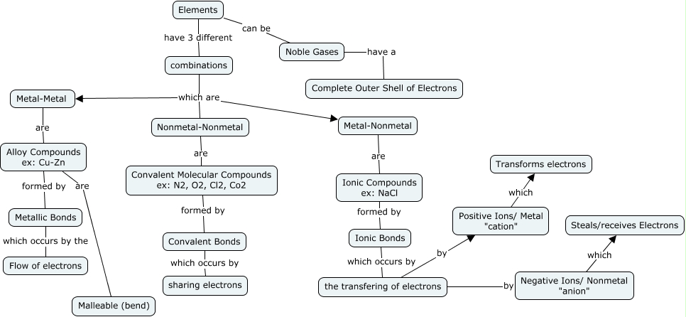 This Concept Map, created with IHMC CmapTools, has information related to: Element Combinations, Metal-Nonmetal are Ionic Compounds ex: NaCl, Metallic Bonds which occurs by the Flow of electrons, Metal-Metal are Alloy Compounds ex: Cu-Zn, Ionic Compounds ex: NaCl formed by Ionic Bonds, Nonmetal-Nonmetal are Convalent Molecular Compounds ex: N2, O2, Cl2, Co2, Convalent Molecular Compounds ex: N2, O2, Cl2, Co2 formed by Convalent Bonds, Elements can be Noble Gases, Alloy Compounds ex: Cu-Zn formed by Metallic Bonds, combinations which are Metal-Metal, Ionic Bonds which occurs by the transfering of electrons, Noble Gases have a Complete Outer Shell of Electrons, Negative Ions/ Nonmetal "anion" which Steals/receives Electrons, Positive Ions/ Metal "cation" which Transforms electrons, combinations which are Nonmetal-Nonmetal, Elements have 3 different combinations, Alloy Compounds ex: Cu-Zn are Malleable (bend), combinations which are Metal-Nonmetal, the transfering of electrons by Negative Ions/ Nonmetal "anion", Convalent Bonds which occurs by sharing electrons, the transfering of electrons by Positive Ions/ Metal "cation"