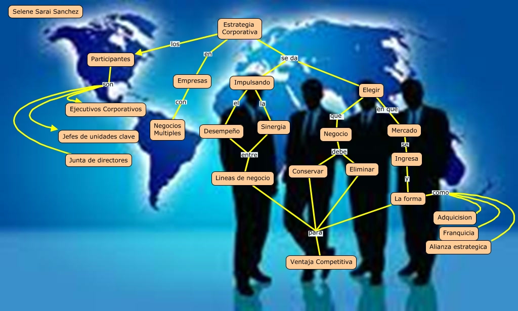Este Cmap, tiene información relacionada con: Estrategia Corporativa, Estrategia Corporativa se da Elegir, Ingresa y La forma, Negocio debe Eliminar, Desempeño entre Lineas de negocio, La forma como Adquicision, La forma para Ventaja Competitiva, Elegir en que Mercado, Conservar para Ventaja Competitiva, Empresas con Negocios Multiples, Impulsando la Sinergia, Lineas de negocio para Ventaja Competitiva, Mercado se Ingresa, Estrategia Corporativa se da Impulsando, Participantes son Ejecutivos Corporativos, La forma como Alianza estrategica, Negocio debe Conservar, Participantes son Jefes de unidades clave, La forma como Franquicia, Participantes son Junta de directores, Sinergia entre Lineas de negocio