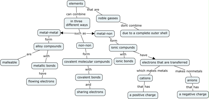 This Concept Map, created with IHMC CmapTools, has information related to: Elements, ionic compunds have electrons that are transferred, metallic bonds have flowing electrons, metal-metal form alloy compounds, elements that are noble gasses, in three different ways such as non-non, noble gasses dont combine due to a complete outer shell, electrons that are transferred which makes metals cations, covalent molecular compunds with covalent bonds, covalent bonds and sharing electrons, in three different ways such as metal-non, in three different ways such as metal-metal, non-non form covalent molecular compunds, ionic compunds with ionic bonds, metal-non form ionic compunds, alloy compounds are malleable, cations that has a positive charge, electrons that are transferred makes nonmetals anions, alloy compounds with metallic bonds, anions that has a negative charge, elements can combine in three different ways