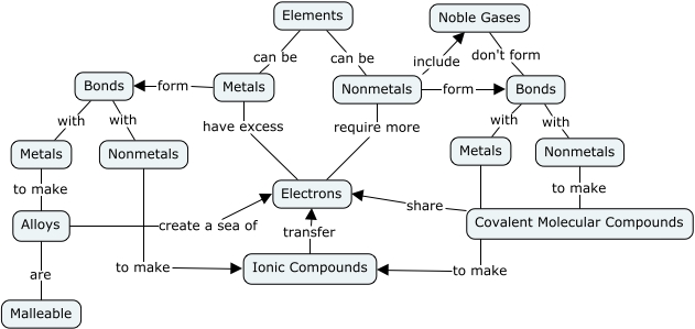 This Concept Map, created with IHMC CmapTools, has information related to: Atomic Bonds, Nonmetals form Bonds, Metals to make Ionic Compounds, Nonmetals to make Ionic Compounds, Nonmetals to make Covalent Molecular Compounds, Ionic Compounds transfer Electrons, Elements can be Nonmetals, Covalent Molecular Compounds share Electrons, Alloys create a sea of Electrons, Bonds with Nonmetals, Noble Gases don't form Bonds, Bonds with Nonmetals, Metals to make Alloys, Elements can be Metals, Alloys are Malleable, Metals have excess Electrons, Nonmetals require more Electrons, Metals form Bonds, Bonds with Metals, Bonds with Metals, Nonmetals include Noble Gases