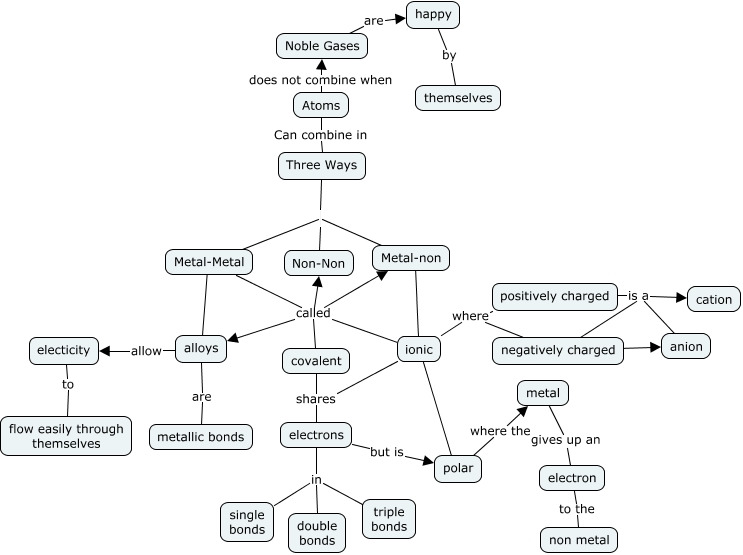 This Concept Map, created with IHMC CmapTools, has information related to: How atoms combine, Three Ways Metal-Metal, Metal-non ???? ionic, Metal-Metal called covalent, negatively charged is a anion, alloys are metallic bonds, Metal-Metal called alloys, Metal-Metal called Metal-non, Metal-Metal ???? alloys, electron to the non metal, positively charged is a anion, Three Ways Metal-non, electrons in double bonds, negatively charged ???? anion, metal gives up an electron, negatively charged is a cation, ionic where negatively charged, Atoms Can combine in Three Ways, Atoms does not combine when Noble Gases, ionic where positively charged, electrons in single bonds