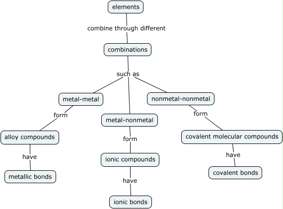 This Concept Map, created with IHMC CmapTools, has information related to: Elements, combinations such as metal-metal, metal-metal form alloy compounds, nonmetal-nonmetal form covalent molecular compounds, ionic compounds have ionic bonds, alloy compounds have metallic bonds, elements combine through different combinations, metal-nonmetal form ionic compounds, combinations such as nonmetal-nonmetal, combinations such as metal-nonmetal, covalent molecular compounds have covalent bonds