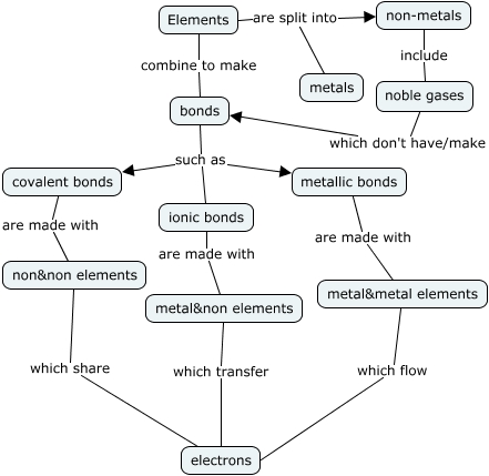 This Concept Map, created with IHMC CmapTools, has information related to: Element bonds, non-metals include noble gases, metallic bonds are made with metal&metal elements, bonds such as covalent bonds, Elements combine to make bonds, noble gases which don't have/make bonds, non&non elements which share electrons, covalent bonds are made with non&non elements, Elements are split into metals, ionic bonds are made with metal&non elements, metal&non elements which transfer electrons, Elements are split into non-metals, metal&metal elements which flow electrons, bonds such as metallic bonds, bonds such as ionic bonds