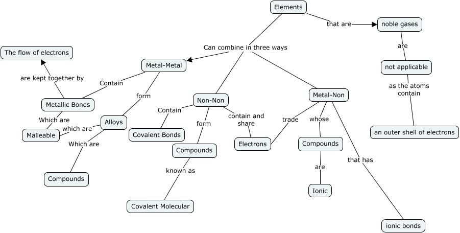 This Concept Map, created with IHMC CmapTools, has information related to: The Elemental Combinations, Elements Can combine in three ways Non-Non, Metal-Non that has ionic bonds, Metal-Metal Contain Metallic Bonds, Metal-Non trade Electrons, Alloys which are Malleable, Alloys Which are Compounds, Elements Can combine in three ways Metal-Metal, Elements that are noble gases, Metallic Bonds are kept together by The flow of electrons, noble gases are not applicable, Metallic Bonds Which are Malleable, Non-Non contain and share Electrons, not applicable as the atoms contain an outer shell of electrons, Non-Non form Compounds, Compounds known as Covalent Molecular, Metal-Metal form Alloys, Compounds are Ionic, Non-Non Contain Covalent Bonds, Elements Can combine in three ways Metal-Non, Metal-Non whose Compounds