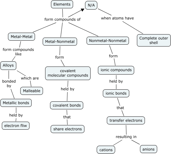 This Concept Map, created with IHMC CmapTools, has information related to: How Elements Combine, N/A when atoms have Complete outer shell, Elements form compounds of Metal-Metal, Alloys which are Malleable, Metal-Metal form compounds like Alloys, ionic compounds held by ionic bonds, covalent molecular compounds held by covalent bonds, ionic bonds that transfer electrons, Alloys bonded by Metallic bonds, Metal-Nonmetal form covalent molecular compounds, transfer electrons resulting in anions, Elements form compounds of N/A, Elements form compounds of Metal-Nonmetal, Nonmetal-Nonmetal form ionic compounds, covalent bonds that share electrons, transfer electrons resulting in cations, Metallic bonds held by electron fliw, Elements form compounds of Nonmetal-Nonmetal