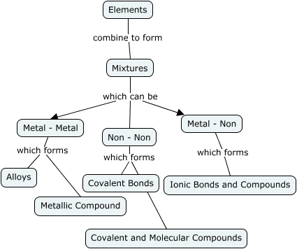 This Concept Map, created with IHMC CmapTools, has information related to: Elements, Bonds and Compunds, Metal - Metal which forms Metallic Compound, Non - Non which forms Covalent and Molecular Compounds, Mixtures which can be Metal - Non, Metal - Non which forms Ionic Bonds and Compounds, Elements combine to form Mixtures, Mixtures which can be Metal - Metal, Mixtures which can be Non - Non, Non - Non which forms Covalent Bonds, Metal - Metal which forms Alloys