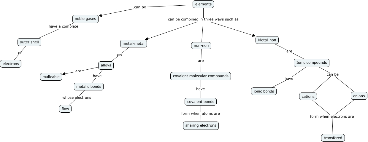 This Concept Map, created with IHMC CmapTools, has information related to: Element combinations, covalent bonds form when atoms are sharing electrons, covalent molecular compounds have covalent bonds, elements can be combined in three ways such as metal-metal, Ionic compounds can be anions, non-non are covalent molecular compounds, elements can be noble gases, Metal-non are Ionic compounds, alloys are malleable, anions form when electrons are transfered, elements can be combined in three ways such as non-non, elements can be combined in three ways such as Metal-non, noble gases have a complete outer shell, cations form when electrons are transfered, alloys have metalic bonds, Ionic compounds have ionic bonds, outer shell of electrons, Ionic compounds can be cations, metalic bonds whose electrons flow, metal-metal are alloys