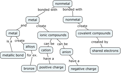 This Concept Map, created with IHMC CmapTools, has information related to: How elemnets combine, alloys for ex. bronze, nonmetal bonded with nonmetal, covalent compounds created by shared electrons, anion have a negative charge, ionic compounds can be anion, metal create ionic compounds, ionic compounds can be cation, nonmetal bonded with metal, cation have a positive charge, metal create alloys, nonmetal create covalent compounds, metal is a metallic bond, metal and metal
