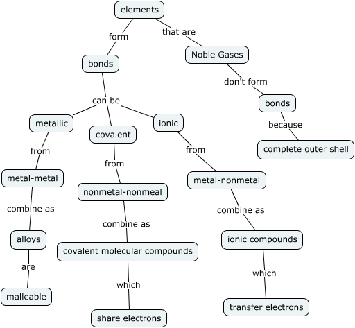 This Concept Map, created with IHMC CmapTools, has information related to: Element Bonds, ionic compounds which transfer electrons, bonds can be covalent, alloys are malleable, metallic from metal-metal, metal-nonmetal combine as ionic compounds, covalent from nonmetal-nonmeal, Noble Gases don't form bonds, ionic from metal-nonmetal, nonmetal-nonmeal combine as covalent molecular compounds, covalent molecular compounds which share electrons, elements that are Noble Gases, bonds can be metallic, elements form bonds, metal-metal combine as alloys, bonds because complete outer shell, bonds can be ionic