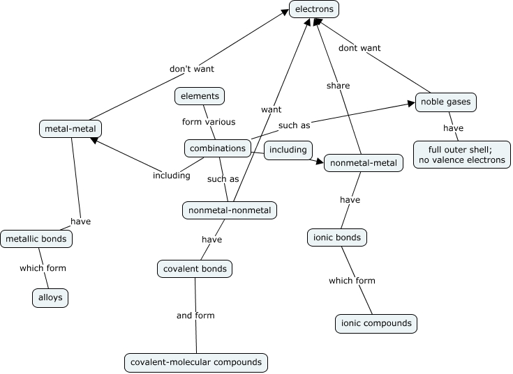 This Concept Map, created with IHMC CmapTools, has information related to: How elements combine, combinations such as nonmetal-nonmetal, elements form various combinations, ionic bonds which form ionic compounds, nonmetal-nonmetal want electrons, combinations ???? nonmetal-metal, combinations such as noble gases, covalent bonds and form covalent-molecular compounds, nonmetal-metal have ionic bonds, metal-metal don't want electrons, metallic bonds which form alloys, nonmetal-nonmetal have covalent bonds, metal-metal have metallic bonds, combinations including metal-metal, noble gases dont want electrons, nonmetal-metal share electrons, noble gases have full outer shell; no valence electrons