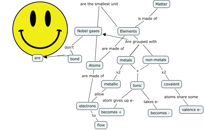 This Concept Map, created with IHMC CmapTools, has information related to: elements, electrons to flow, non-metals x2 covalent, covalent atoms share some valence e-, Matter is made of Elements, metallic allow electrons, Elements Are grouped with Nobel gases, Atoms are the smallest unit Elements, metals + Ionic, Elements are made of Atoms, bond are, metals x2 metallic, non-metals + Ionic, Nobel gases don't bond, Elements Are grouped with metals, Elements Are grouped with non-metals, Atoms are made of electrons, Elements Are grouped with metals, Ionic takes e- becomes -, Ionic atom gives up e- becomes +