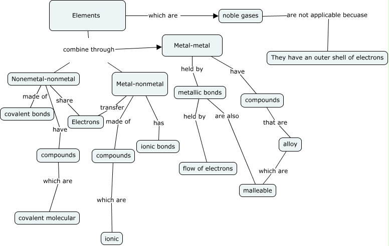 This Concept Map, created with IHMC CmapTools, has information related to: elements combine, Elements combine through Nonemetal-nonmetal, Elements which are noble gases, Nonemetal-nonmetal made of covalent bonds, noble gases are not applicable becuase They have an outer shell of electrons, Metal-nonmetal made of compounds, metallic bonds held by flow of electrons, Elements combine through Metal-metal, compounds which are ionic, compounds that are alloy, Metal-metal held by metallic bonds, alloy which are malleable, metallic bonds are also malleable, Elements combine through Metal-nonmetal, Metal-nonmetal has ionic bonds, compounds which are covalent molecular, Nonemetal-nonmetal have compounds, Metal-nonmetal transfer Electrons, Metal-metal have compounds, Nonemetal-nonmetal share Electrons