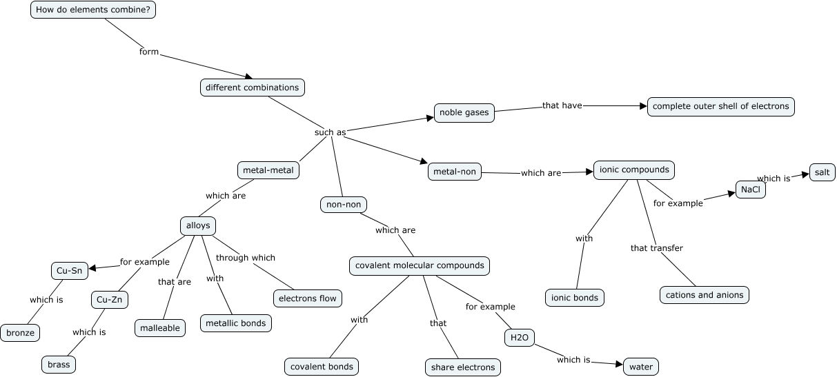 This Concept Map, created with IHMC CmapTools, has information related to: Elements, metal-metal which are alloys, alloys for example Cu-Zn, alloys with metallic bonds, covalent molecular compounds that share electrons, noble gases that have complete outer shell of electrons, covalent molecular compounds for example H2O, ionic compounds with ionic bonds, alloys that are malleable, metal-non which are ionic compounds, alloys for example Cu-Sn, different combinations such as metal-metal, NaCl which is salt, ionic compounds for example NaCl, different combinations such as noble gases, alloys through which electrons flow, H2O which is water, Cu-Zn which is brass, different combinations such as metal-non, non-non which are covalent molecular compounds, How do elements combine? form different combinations