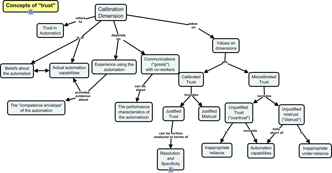 This Concept Map, created with IHMC CmapTools, has information related to: Trust in Automation-Calibration of Trust, Calibrated Trust includes Justified Mistrust, Unjustified Trust ("overtrust") is Inappropriate reliance, Experience using the automation provides evidence about The "competence envelope" of the automation, Communications ("gossip") with co-workers can be about The performance characteristics of the automatioon, Calibration Dimension refers to Trust in Automation, Calibration Dimension is of Actual automation capabilities, Calibration Dimension depends on Experience using the automation, Calibration Dimension depends on Communications ("gossip") with co-workers, Unjustified mistrust ("distrust") is Inappropriate under-reliance, Values on dimensions are Miscalibrated Trust, Beliefs about the automation Actual automation capabilities, Calibration Dimension is of Beliefs about the automation, Unjustified mistrust ("distrust") falls short of Automation capabilities, Values on dimensions are Calibrated Trust, Miscalibrated Trust includes Unjustified Trust ("overtrust"), Calibration Dimension takes on Values on dimensions, Calibrated Trust includes Justified Trust, Experience using the automation provides evidence about Actual automation capabilities, Justified Trust can be further analyzed in terms of Resolution and Specificity, Unjustified Trust ("overtrust") exceeds Automation capabilities