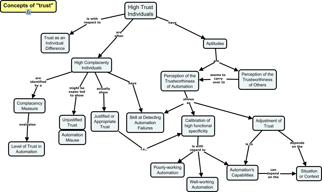 This Concept Map, created with IHMC CmapTools, has information related to: Interpersonal Trust-High Trust Individuals, High Trust Individuals is with respect to Trust as an Individual Difference, Adjustment of Trust depends on the Situation or Context, High Complacenty Individuals are identified by a Complacency Measure, Complacency Measure evaluates Level of Trust in Automaiton, High Trust Individuals have Aptitudes, Calibration of high functional specificiity is with regard to Well-working Automation, High Complacenty Individuals might be expec ted to show Unjustified Trust, Adjustment of Trust is to Automation's Capabilities, Aptitudes are Perception of the Trustworthiness of Automation, Automation's Capabilities can depend on the Situation or Context, High Complacenty Individuals have Skill at Detecting Automation Failures, Aptitudes are Perception of the Trustworthiness of Others, Perception of the Trustworthiness of Automation shows as Adjustment of Trust, Calibration of high functional specificiity is with regard to Automation's Capabilities, Calibration of high functional specificiity is with regard to Poorly-working Automation, High Trust Individuals are often High Complacenty Individuals, Perception of the Trustworthiness of Automation shows as Skill at Detecting Automation Failures, Justified or Appropriate Trust i.e., Calibration of high functional specificiity, Perception of the Trustworthiness of Others seems to carry over to Perception of the Trustworthiness of Automation, Perception of the Trustworthiness of Automation shows as Calibration of high functional specificiity