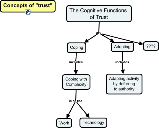 This Concept Map, created with IHMC CmapTools, has information related to: Functionality of Trust-Cognitive, The Cognitive Functions of Trust are Adapting, Coping with Complexity is of the Technology, Coping with Complexity is of the Work, The Cognitive Functions of Trust are ????, Coping includes Coping with Complexity, Adapting includes Adapting activity by deferring to authority, The Cognitive Functions of Trust are Coping