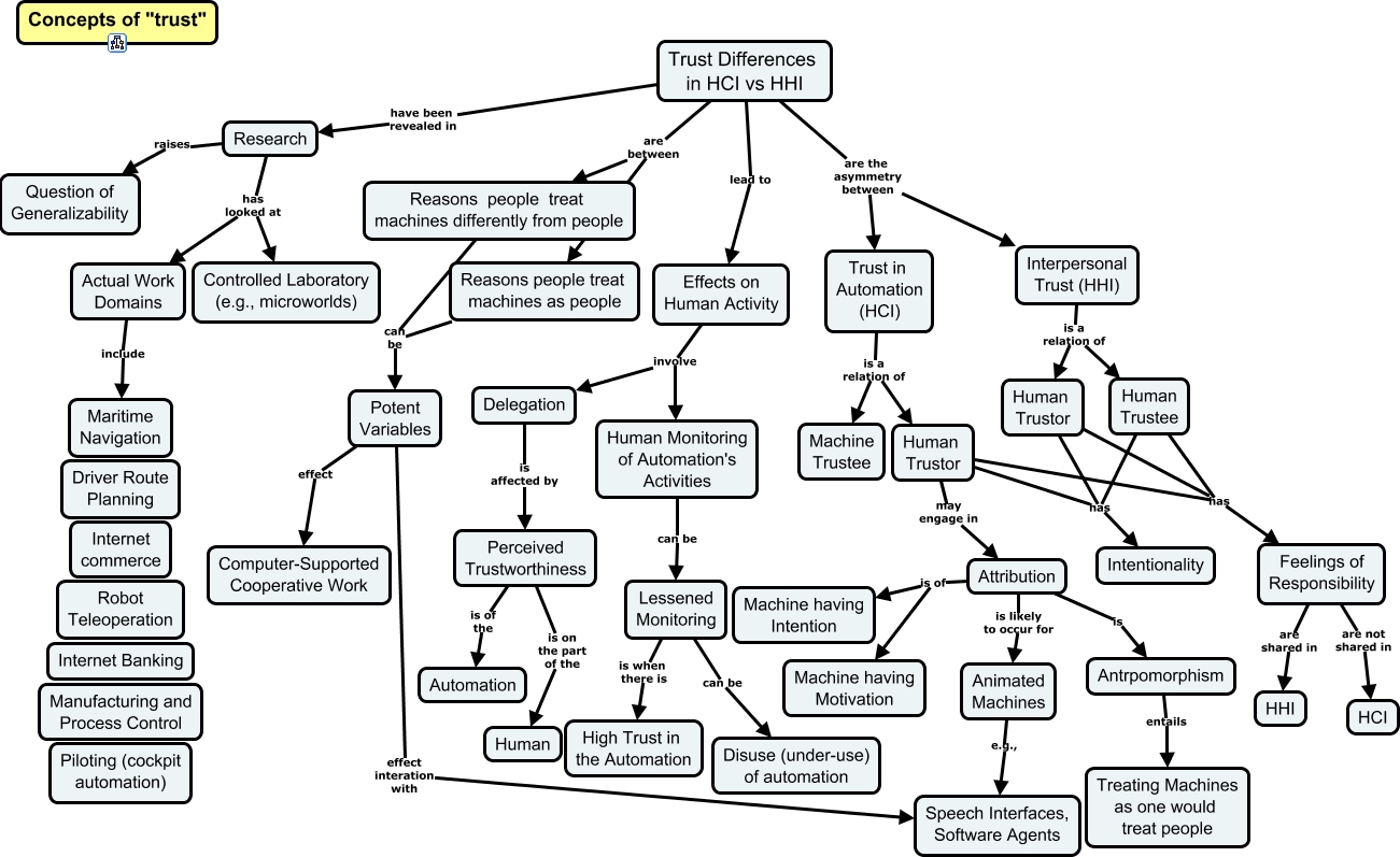 This Concept Map, created with IHMC CmapTools, has information related to: HCI vs HHI-Trust Differences, Potent Variables effect interation with Speech Interfaces, Software Agents, Human Trustor has Intentionality, Trust Differences in HCI vs HHI are between Reasons people treat machines as people, Attribution is Antrpomorphism, Lessened Monitoring can be Disuse (under-use) of automation, Reasons people treat machines differently from people can be Potent Variables, Antrpomorphism entails Treating Machines as one would treat people, Human Monitoring of Automation's Activities can be Lessened Monitoring, Trust Differences in HCI vs HHI are between Reasons people treat machines differently from people, Potent Variables effect Computer-Supported Cooperative Work, Attribution is of Machine having Intention, Research has looked at Controlled Laboratory (e.g., microworlds), Research has looked at Actual Work Domains, Trust Differences in HCI vs HHI are the asymmetry between Trust in Automation (HCI), Animated Machines e.g., Speech Interfaces, Software Agents, Feelings of Responsibility are shared in HHI, Human Trustor has Feelings of Responsibility, Actual Work Domains include Maritime Navigation, Interpersonal Trust (HHI) is a relation of Human Trustor, Feelings of Responsibility are not shared in HCI
