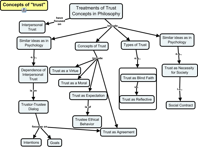This Concept Map, created with IHMC CmapTools, has information related to: The Concept of Trust-Philosophical Views, Concepts of Trust include Trust as Agreement, Treatments of Trust Concepts in Philosophy include Types of Trust, Similar ideas as in Psychology e.g., Dependence of Interpersonal Trust, Treatments of Trust Concepts in Philosophy have focused on Interpersonal Trust, Treatments of Trust Concepts in Philosophy include Similar ideas as in Psychology, Trust as Blind Faith vs. Trust as Reflective, Trust as Expectation is of Trustee Ethical Behavior, Trustor-Trustee Dialog focuses on Trust as Agreement, Types of Trust e.g., ????, Dependence of Interpersonal Trust is on Trustor-Trustee Dialog, Treatments of Trust Concepts in Philosophy include Concepts of Trust, Trust as Necessity for Society i.e., Social Contract, Concepts of Trust include Trust as a Virtue, Trustor-Trustee Dialog focuses on Intentions, Similar ideas as in Psychology e.g., Trust as Necessity for Society, Concepts of Trust include Trust as a Moral, Trustor-Trustee Dialog focuses on Goals, Concepts of Trust include Trust as Expectation, Treatments of Trust Concepts in Philosophy include Similar ideas as in Psychology