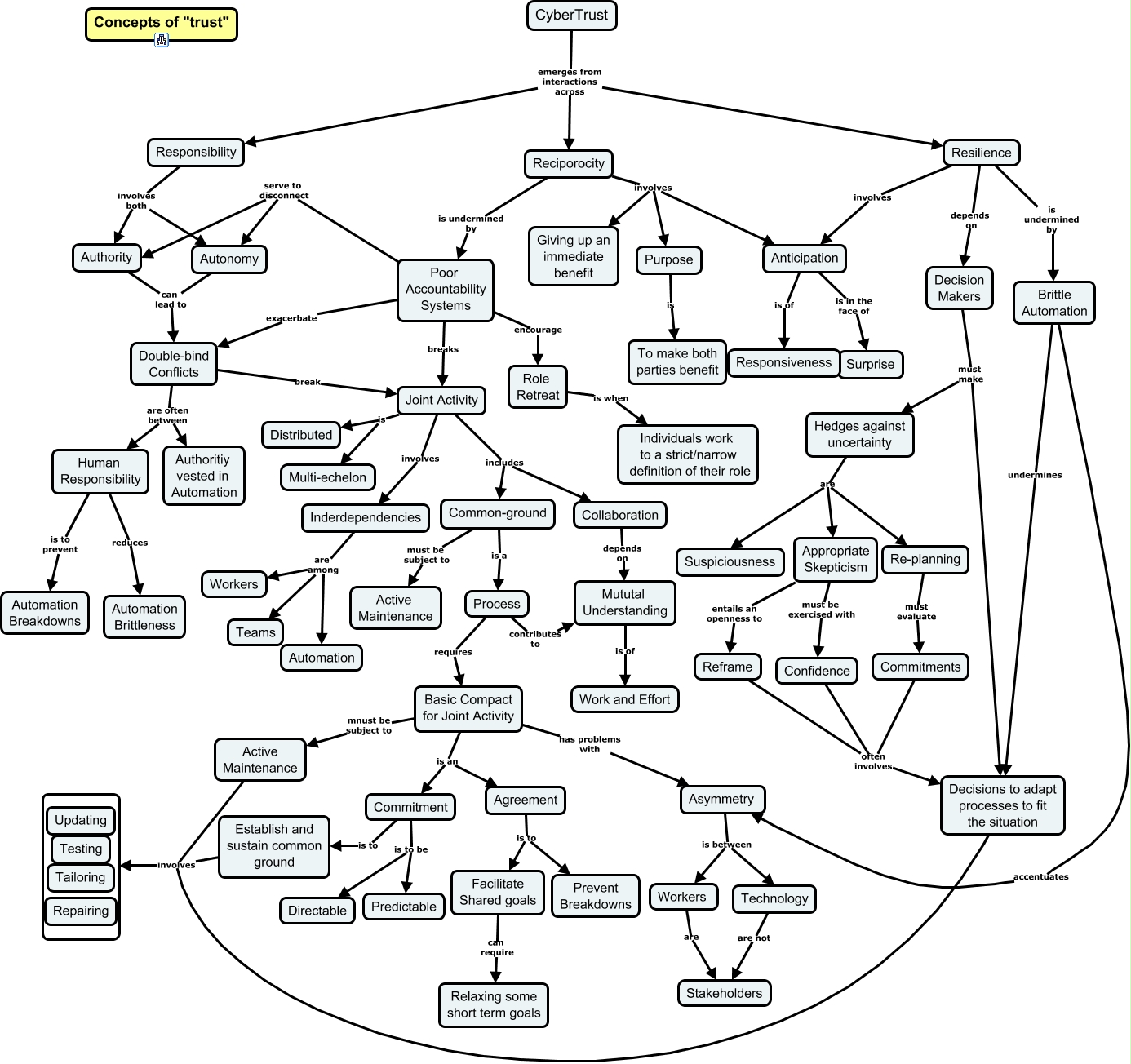 This Concept Map, created with IHMC CmapTools, has information related to: Trust in Networks-Dynamics of Cyberwork, Joint Activity includes Common-ground, Agreement is to Prevent Breakdowns, Reframe often involves Decisions to adapt processes to fit the situation, Responsibility involves both Authority, Basic Compact for Joint Activity has problems with Asymmetry, Brittle Automation undermines Decisions to adapt processes to fit the situation, Decision Makers must make Decisions to adapt processes to fit the situation, Role Retreat is when Individuals work to a strict/narrow definition of their role, Establish and sustain common ground involves ????, Joint Activity is Distributed, Process requires Basic Compact for Joint Activity, Purpose is To make both parties benefit, Poor Accountability Systems serve to disconnect Authority, Double-bind Conflicts break Joint Activity, Decision Makers must make Hedges against uncertainty, Reciporocity involves Giving up an immediate benefit, Joint Activity includes Collaboration, Re-planning must evaluate Commitments, Basic Compact for Joint Activity is an Commitment, Double-bind Conflicts are often between Human Responsibility