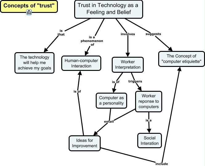 This Concept Map, created with IHMC CmapTools, has information related to: Trust in Automation -Trust as Feeling and Belief, Ideas for Improvement include The Concept of "computer etiquiette", Worker Interpretation is of Computer as a personality, Trust in Technology as a Feeling and Belief is that The technology will help me achieve my goals, Worker reponse to computers is a Social Interation, Trust in Technology as a Feeling and Belief involves Worker Interpretation, Worker reponse to computers entail Ideas for Improvement, Trust in Technology as a Feeling and Belief is a phenomenon of Human-computer Interaction, Computer as a personality entail Ideas for Improvement, Trust in Technology as a Feeling and Belief suggests The Concept of "computer etiquiette", Worker Interpretation triggers Worker reponse to computers, Ideas for Improvement is of Human-computer Interaction