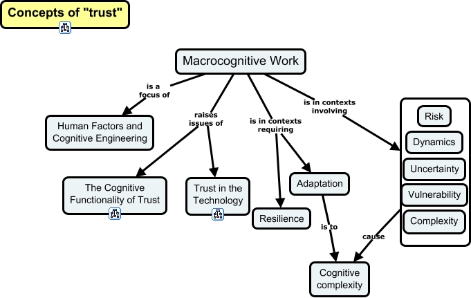 This Concept Map, created with IHMC CmapTools, has information related to: Organizational Trust-Trust in Macrocognitive Work, Macrocognitive Work is a focus of Human Factors and Cognitive Engineering, ???? cause Cognitive complexity, Macrocognitive Work raises issues of Trust in the Technology, Macrocognitive Work is in contexts involving ????, Adaptation is to Cognitive complexity, Macrocognitive Work is in contexts requiring Adaptation, Macrocognitive Work raises issues of The Cognitive Functionality of Trust, Macrocognitive Work is in contexts requiring Resilience
