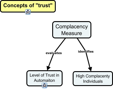 This Concept Map, created with IHMC CmapTools, has information related to: Trust in Automation-Complacency Measurement, Complacency Measure identifies High Complacenty Individuals, Complacency Measure evaluates Level of Trust in Automaiton