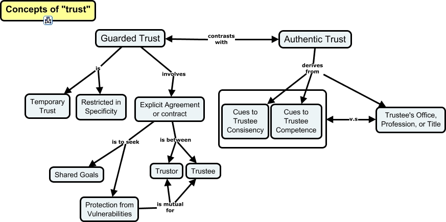 This Concept Map, created with IHMC CmapTools, has information related to: The Concept of Trust-Guarded Trust, Guarded Trust is Restricted in Specificity, Authentic Trust derives from Trustee's Office, Profession, or Title, Guarded Trust is Temporary Trust, Explicit Agreement or contract is between Trustor, Explicit Agreement or contract is between Trustee, Authentic Trust derives from Cues to Trustee Competence, Authentic Trust derives from Cues to Trustee Consisency, Protection from Vulnerabilities is mutual for Trustee, Explicit Agreement or contract is to seek Protection from Vulnerabilities, Explicit Agreement or contract is to seek Shared Goals, Guarded Trust involves Explicit Agreement or contract, Protection from Vulnerabilities is mutual for Trustor