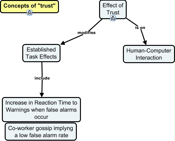 This Concept Map, created with IHMC CmapTools, has information related to: Trust in Automation-Operator's Cognitive Processes-Effect of Trust, Effect of Trust modifies Established Task Effects, Established Task Effects include Increase in Reaction Time to Warnings when false alarms occur, Effect of Trust is on Human-Computer Interaction