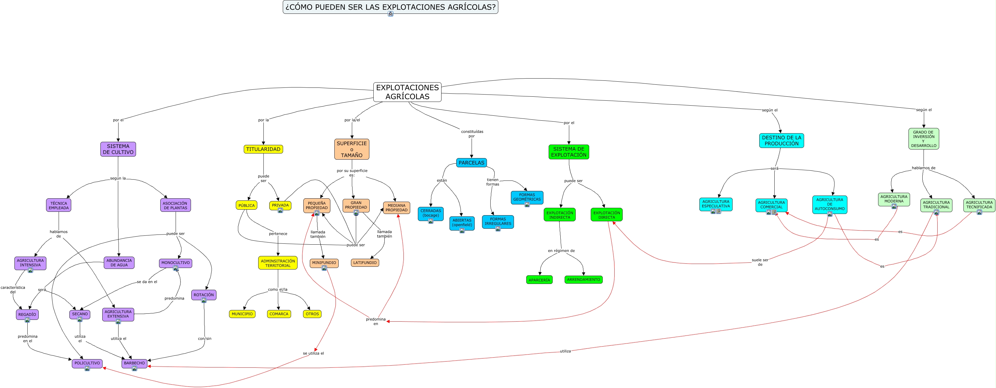 Este Cmap, tiene información relacionada con: 01. Los espacios agrarios, SISTEMA DE CULTIVO según la TÉCNICA EMPLEADA, PÚBLICA puede ser MEDIANA PROPIEDAD, AGRICULTURA EXTENSIVA utiliza el BARBECHO, PRIVADA puede ser PEQUEÑA PROPIEDAD, MONOCULTIVO se da en el SECANO, EXPLOTACIÓN DIRECTA predomina en MEDIANA PROPIEDAD, PÚBLICA puede ser PEQUEÑA PROPIEDAD, SISTEMA DE CULTIVO según la ASOCIACIÓN DE PLANTAS, PEQUEÑA PROPIEDAD llamada también MINIFUNDIO, ABUNDANCIA DE AGUA será SECANO, AGRICULTURA INTENSIVA característica del REGADÍO, SISTEMA DE EXPLOTACIÓN puede ser EXPLOTACIÓN INDIRECTA, PARCELAS están ABIERTAS (openfield), EXPLOTACIONES AGRÍCOLAS por la TITULARIDAD, EXPLOTACIÓN INDIRECTA en régimen de ARRENDAMIENTO, ASOCIACIÓN DE PLANTAS puede ser MONOCULTIVO, ASOCIACIÓN DE PLANTAS puede ser ROTACIÓN, ADMINSITRACIÓN TERRITORIAL como el/la MUNICIPIO, DESTINO DE LA PRODUCCIÓN será AGRICULTURA DE AUTOCONSUMO, EXPLOTACIÓN INDIRECTA en régimen de APARCERÍA