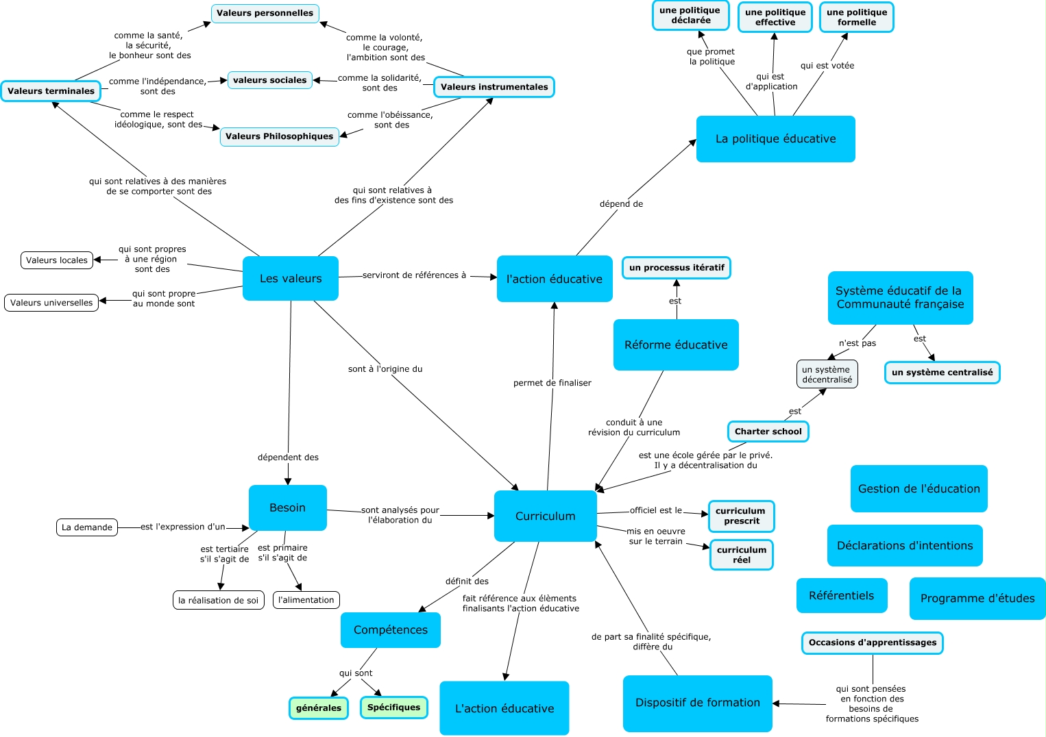 Cette carte de concepts créée avec IHMC CmapTools traite de: Cmap_Joséphine, Curriculum définit des Compétences, Valeurs instrumentales comme la volonté, le courage, l'ambition sont des Valeurs personnelles, Les valeurs qui sont propres à une région sont des Valeurs locales, Curriculum fait référence aux élèments finalisants l'action éducative L'action éducative, Dispositif de formation de part sa finalité spécifique, diffère du Curriculum, Les valeurs sont à l'origine du Curriculum, Réforme éducative conduit à une révision du curriculum Curriculum, Les valeurs serviront de références à l'action éducative, La politique éducative qui est d'application une politique effective, Curriculum permet de finaliser l'action éducative, Curriculum officiel est le curriculum prescrit, Curriculum mis en oeuvre sur le terrain curriculum réel, La politique éducative qui est votée une politique formelle, Système éducatif de la Communauté française est un système centralisé, Les valeurs qui sont propre au monde sont Valeurs universelles, Réforme éducative est un processus itératif, Compétences qui sont générales, Les valeurs qui sont relatives à des fins d'existence sont des Valeurs instrumentales, La politique éducative que promet la politique une politique déclarée, Valeurs terminales comme le respect idéologique, sont des Valeurs Philosophiques