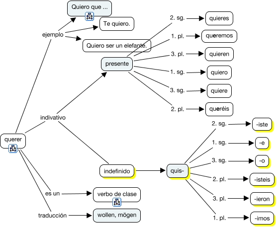 Dieses mit IHMC CmapTools erstellte CMap hat Informationen bezüglich: conjugación querer, querer es un verbo de clase, presente 1. pl. queremos, quis- 3. pl. -ieron, quis- 1. sg. -e, presente 1. sg. quiero, indefinido quis-, querer traducción wollen, mögen, querer ejemplo Quiero que ..., quis- 3. sg. -o, presente 3. sg. quiere, quis- 1. pl. -imos, presente 2. pl. queréis, querer indivativo indefinido, querer indivativo presente, quis- 2. pl. -isteis, presente 3. pl. quieren, presente 2. sg. quieres, querer ejemplo Te quiero., querer ejemplo Quiero ser un elefante., quis- 2. sg. -iste