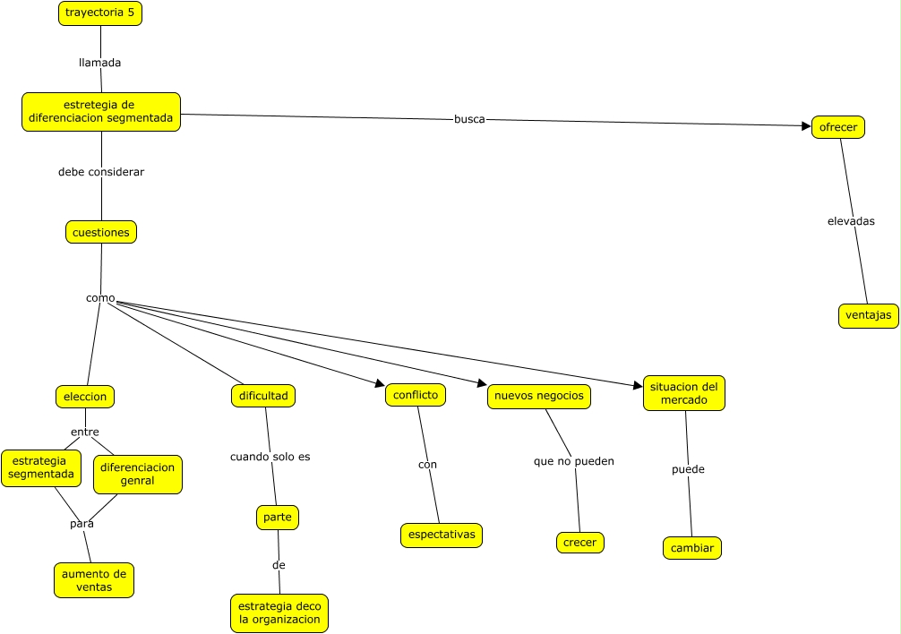 Este Cmap, tiene información relacionada con: trayectoria 5, parte de estrategia deco la organizacion, conflicto con espectativas, cuestiones como eleccion, eleccion entre estrategia segmentada, estrategia segmentada para aumento de ventas, cuestiones como dificultad, eleccion entre diferenciacion genral, trayectoria 5 llamada estretegia de diferenciacion segmentada, cuestiones como conflicto, dificultad cuando solo es parte, estretegia de diferenciacion segmentada busca ofrecer, cuestiones como nuevos negocios, ofrecer elevadas ventajas, diferenciacion genral para aumento de ventas, estretegia de diferenciacion segmentada debe considerar cuestiones, situacion del mercado puede cambiar, nuevos negocios que no pueden crecer, cuestiones como situacion del mercado