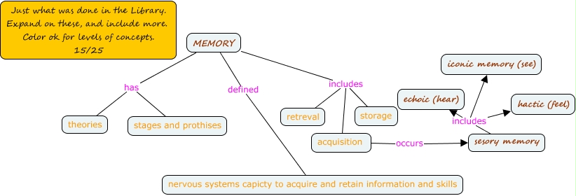 This Concept Map, created with IHMC CmapTools, has information related to: Chapter 6 mlwalker 15, sesory memory includes iconic memory (see), MEMORY includes retreval, MEMORY includes acquisition, MEMORY has theories, sesory memory includes echoic (hear), MEMORY has stages and prothises, sesory memory includes hactic (feel), acquisition occurs sesory memory, MEMORY defined nervous systems capicty to acquire and retain information and skills, MEMORY includes storage
