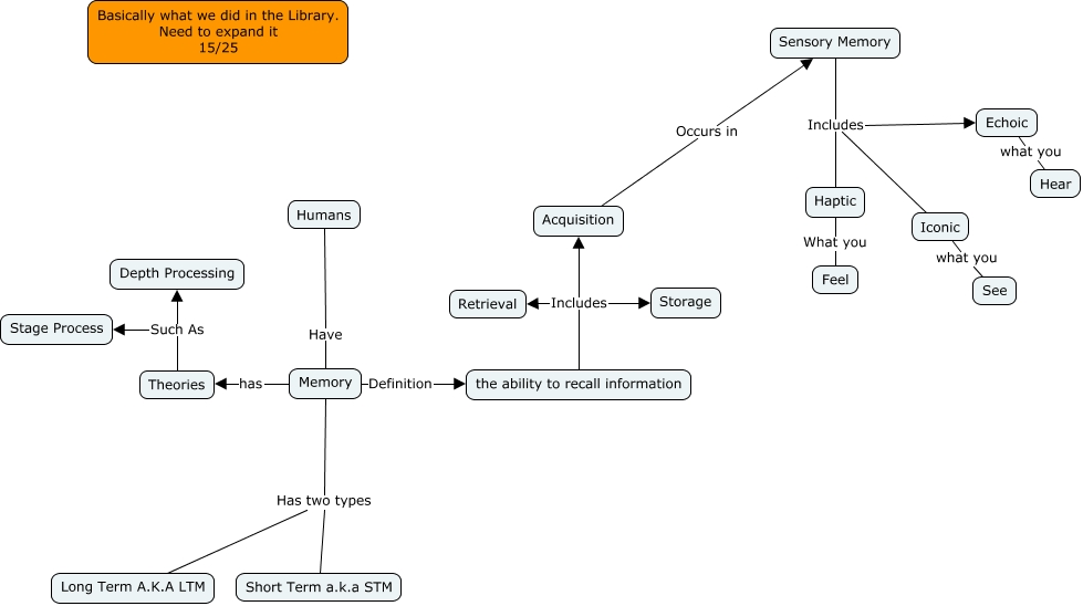 This Concept Map, created with IHMC CmapTools, has information related to: Ch. 6 Ethan Malcolm 15, Haptic What you Feel, Echoic what you Hear, Theories Such As Depth Processing, Theories Such As Stage Process, Humans Have Memory, Memory Definition the ability to recall information, the ability to recall information Includes Acquisition, Sensory Memory Includes Iconic, Memory has Theories, Iconic what you See, Memory Has two types Short Term a.k.a STM, the ability to recall information Includes Storage, the ability to recall information Includes Retrieval, Sensory Memory Includes Echoic, Acquisition Occurs in Sensory Memory, Memory Has two types Long Term A.K.A LTM, Sensory Memory Includes Haptic