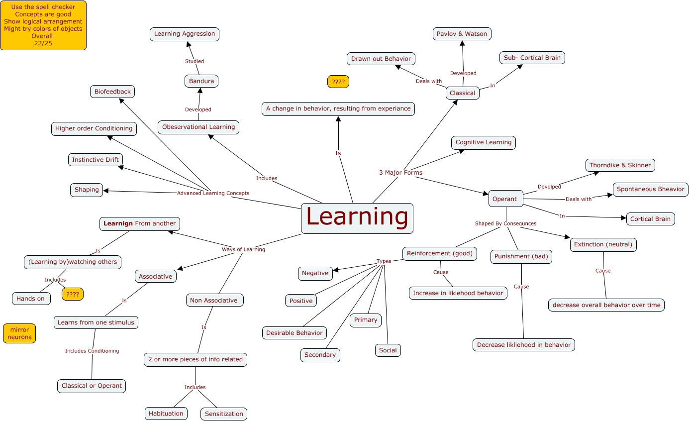 This Concept Map, created with IHMC CmapTools, has information related to: Chapter 6 Emily Clunk 23, Learning Ways of Learning Non Associative, Operant In Cortical Brain, Learning Advanced Learning Concepts Instinctive Drift, Learning 3 Major Forms Classical, Learning Advanced Learning Concepts Higher order Conditioning, Non Associative Is 2 or more pieces of info related, Classical In Sub- Cortical Brain, Learning Is A change in behavior, resulting from experiance, (Learning by)watching others Includes Hands on, Operant Shaped By Consequnces Punishment (bad), Classical Developed Pavlov & Watson, Reinforcement (good) Types Secondary, Reinforcement (good) Types Social, Extinction (neutral) Cause decrease overall behavior over time, Reinforcement (good) Types Primary, Learning Advanced Learning Concepts Biofeedback, Learning 3 Major Forms Cognitive Learning, Classical Deals with Drawn out Behavior, Reinforcement (good) Cause Increase in likiehood behavior, Punishment (bad) Cause Decrease likliehood in behavior