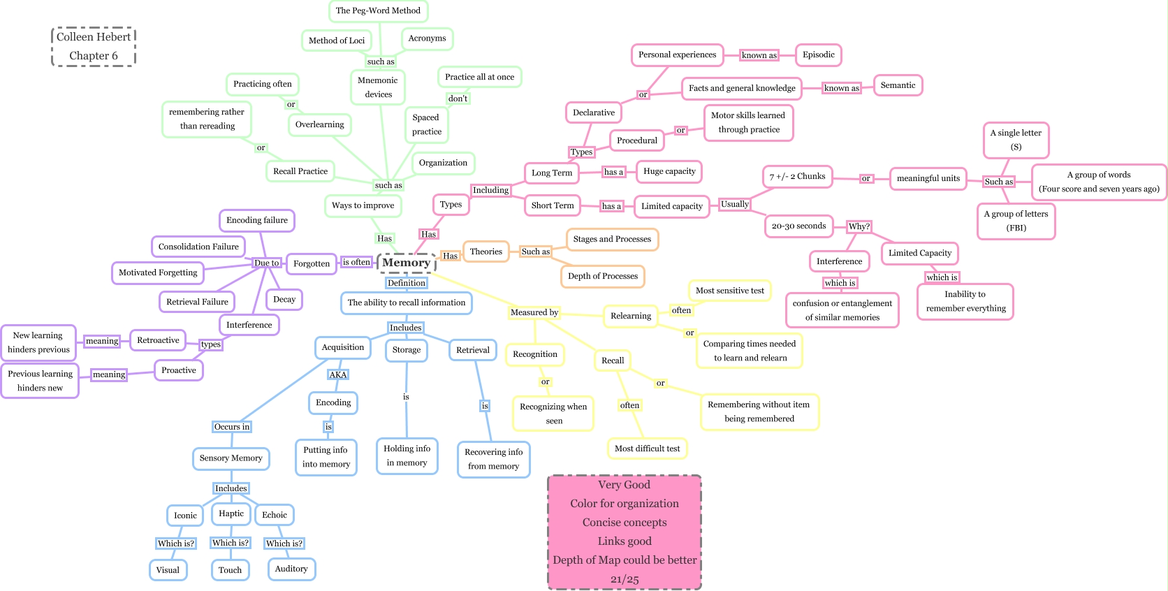 This Concept Map, created with IHMC CmapTools, has information related to: Ch. 6 Colleen Hebert (Final) 21, Memory Has Ways to improve, Mnemonic devices such as Acronyms, Encoding is Putting info into memory, 20-30 seconds Why? Limited Capacity, Interference types Retroactive, Proactive meaning Previous learning hinders new, Long Term Types Declarative, Ways to improve such as Organization, Relearning or Comparing times needed to learn and relearn, Ways to improve such as Recall Practice, 20-30 seconds Why? Interference, Memory Measured by Recognition, The ability to recall information Includes Retrieval, Declarative or Facts and general knowledge, Storage is Holding info in memory, The ability to recall information Includes Storage, meaningful units Such as A group of words (Four score and seven years ago), Sensory Memory Includes Echoic, meaningful units Such as A group of letters (FBI), Recall often Most difficult test