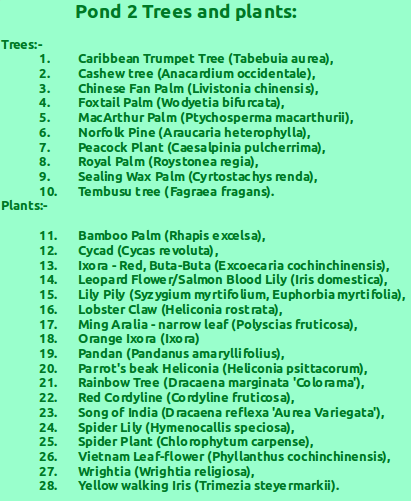 Fish-pond-2.jpg Macathur-Foxtail-Palms.jpg Pond-2-List.png Zone02-Blindness_Tree-01.jpg Zone02-Chinese fan palm-01.JPG Zone02-Chinese fan palm-02.JPG Zone-02-CordylineFruticosa-01.JPG Zone-02-Cycad-01.JPG Zone-02-Cycad-02.JPG Zone-02-FoxTailPalm-01.JPG Zone-02-FoxTailPalm-02.JPG Zone-02-Heliconia_Psittacorum-01.JPG Zone-02-Heliconia_Rostrata-01.JPG Zone-02-Ixora-01.JPG Zone02-Licuala_Grandis-01.JPG Zone02-Licuala_Grandis-02.JPG Zone02-Licuala_Grandis-03.JPG Zone-02-McArthurPalms-01.JPG Zone02-Mouse-tail-Plant-01.JPG Zone02-Mouse-tail-Plant-02.JPG Zone-02-Norfolk-Island-pine-01.JPG Zone-02-Norfolk-Island-pine-02.JPG Zone-02-Norfolk-Island-pine-03.JPG Zone-02-Pandan-01.JPG Zone-02-Peacock_Flower-01.jpg Zone02-Sealin-Wax-Plant-01.JPG Zone02-Sealin-Wax-Plant-02.JPG Zone02-Spider_Plant-01.jpg Zone-02-Striped_Dracaena-01.JPG Zone-02-Syzygium myrtifolium-01.JPG Zone-02-Syzygium myrtifolium-02.JPG Zone-02-Syzygium myrtifolium-03.JPG Zone-02-Wrightia-religiosa-01.JPG Zone-02-Wrightia-religiosa-02.JPG Zone-02-Wrightia-religiosa-03.JPG Zone2-02-PoachedEgg-Tree-01.jpg Zone2-02-PoachedEgg-Tree-02.jpg Zone2-02-PoachedEgg-Tree-03.jpg Zone2-Leopard-Flower-01.JPG Zone2-Leopard-Flower-02.JPG Zone2-Leopard-Flower-03.JPG Zone2-Leopard-Flower-04.JPG