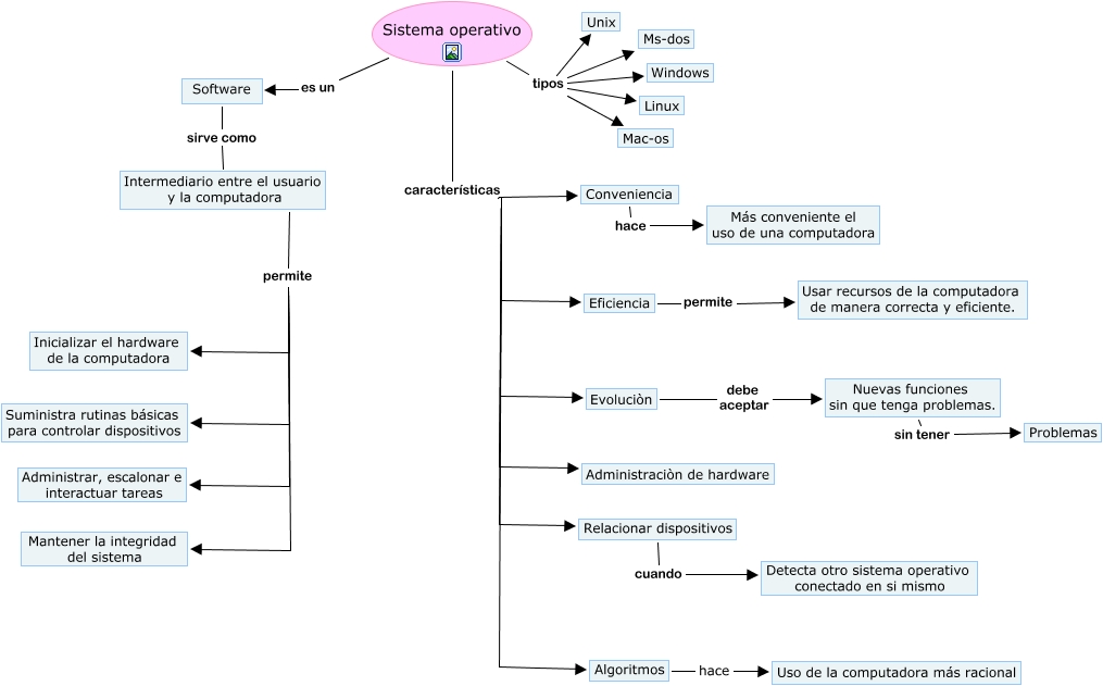 Este Cmap, tiene información relacionada con: sistema operativo, Intermediario entre el usuario y la computadora permite Suministra rutinas básicas para controlar dispositivos, Sistema operativo características Evoluciòn, Sistema operativo características Algoritmos, Nuevas funciones sin que tenga problemas. sin tener Problemas, Intermediario entre el usuario y la computadora permite Mantener la integridad del sistema, Eficiencia permite Usar recursos de la computadora de manera correcta y eficiente., Sistema operativo características Eficiencia, Sistema operativo características Administraciòn de hardware, Sistema operativo tipos Linux, Evoluciòn debe aceptar Nuevas funciones sin que tenga problemas., Relacionar dispositivos cuando Detecta otro sistema operativo conectado en si mismo, Sistema operativo tipos Mac-os, Sistema operativo tipos Unix, Algoritmos hace Uso de la computadora más racional, Sistema operativo tipos Ms-dos, Software sirve como Intermediario entre el usuario y la computadora, Intermediario entre el usuario y la computadora permite Administrar, escalonar e interactuar tareas, Intermediario entre el usuario y la computadora permite Inicializar el hardware de la computadora, Sistema operativo tipos Windows, Sistema operativo características Relacionar dispositivos