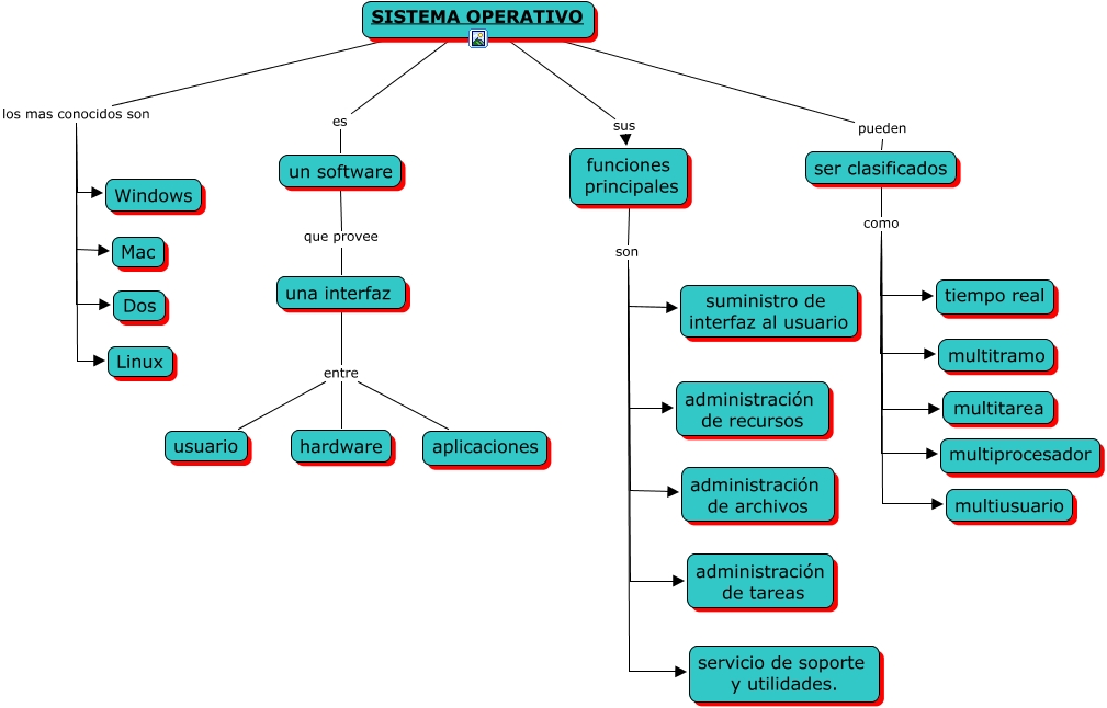Este Cmap, tiene información relacionada con: Sistema Operativo, funciones principales son administración de tareas, SISTEMA OPERATIVO sus funciones principales, SISTEMA OPERATIVO los mas conocidos son Dos, SISTEMA OPERATIVO los mas conocidos son Mac, SISTEMA OPERATIVO pueden ser clasificados, ser clasificados como multitramo, SISTEMA OPERATIVO los mas conocidos son Windows, un software que provee una interfaz, una interfaz entre usuario, funciones principales son administración de recursos, funciones principales son suministro de interfaz al usuario, una interfaz entre aplicaciones, ser clasificados como multiprocesador, una interfaz entre hardware, SISTEMA OPERATIVO es un software, funciones principales son administración de archivos, ser clasificados como tiempo real, funciones principales son servicio de soporte y utilidades., SISTEMA OPERATIVO los mas conocidos son Linux, ser clasificados como multiusuario